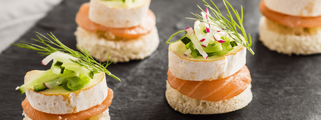 Voor 4 personen: Voor 6 zakouskis: 1 stuk Maredsous® Fagotin Tradition 2 Bagnat-broodjes 1 venkel 1 radijs 1 komkommer 2 uien 50 g suiker 1 plak gerookte zalm Honing Dille