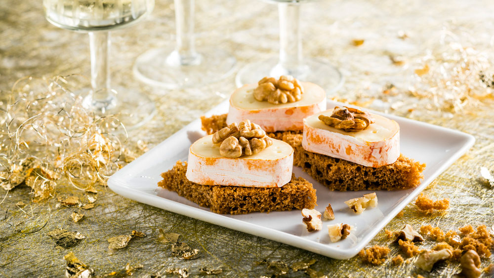 Voor 4 personen: 1 stronkje Maredsous® Fagotin Tradition 4 plakjes ontbijtkoek Enkele walnoten